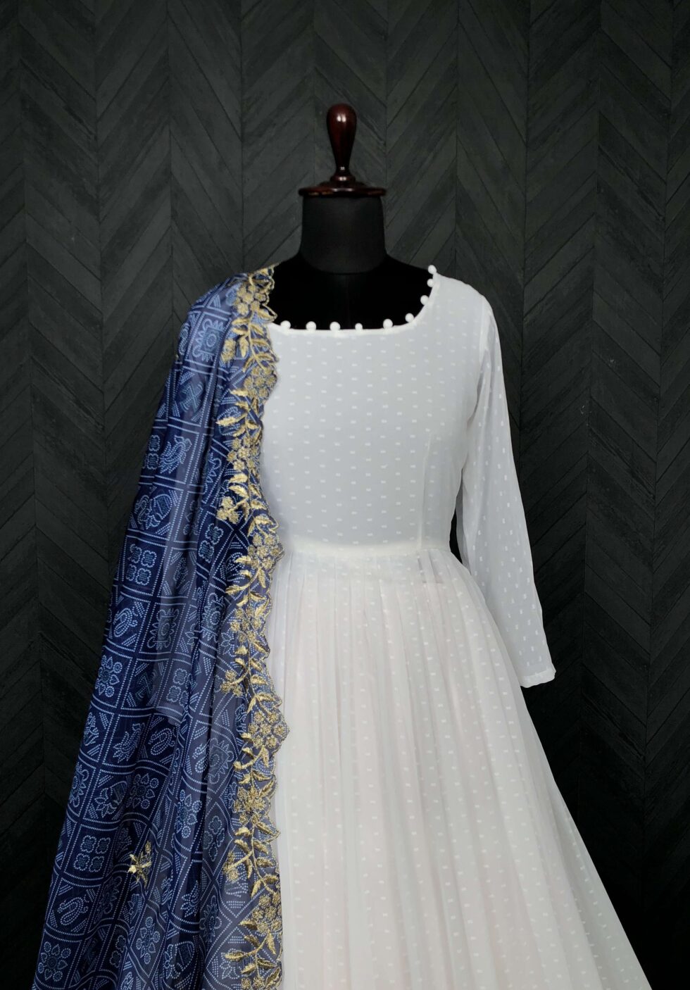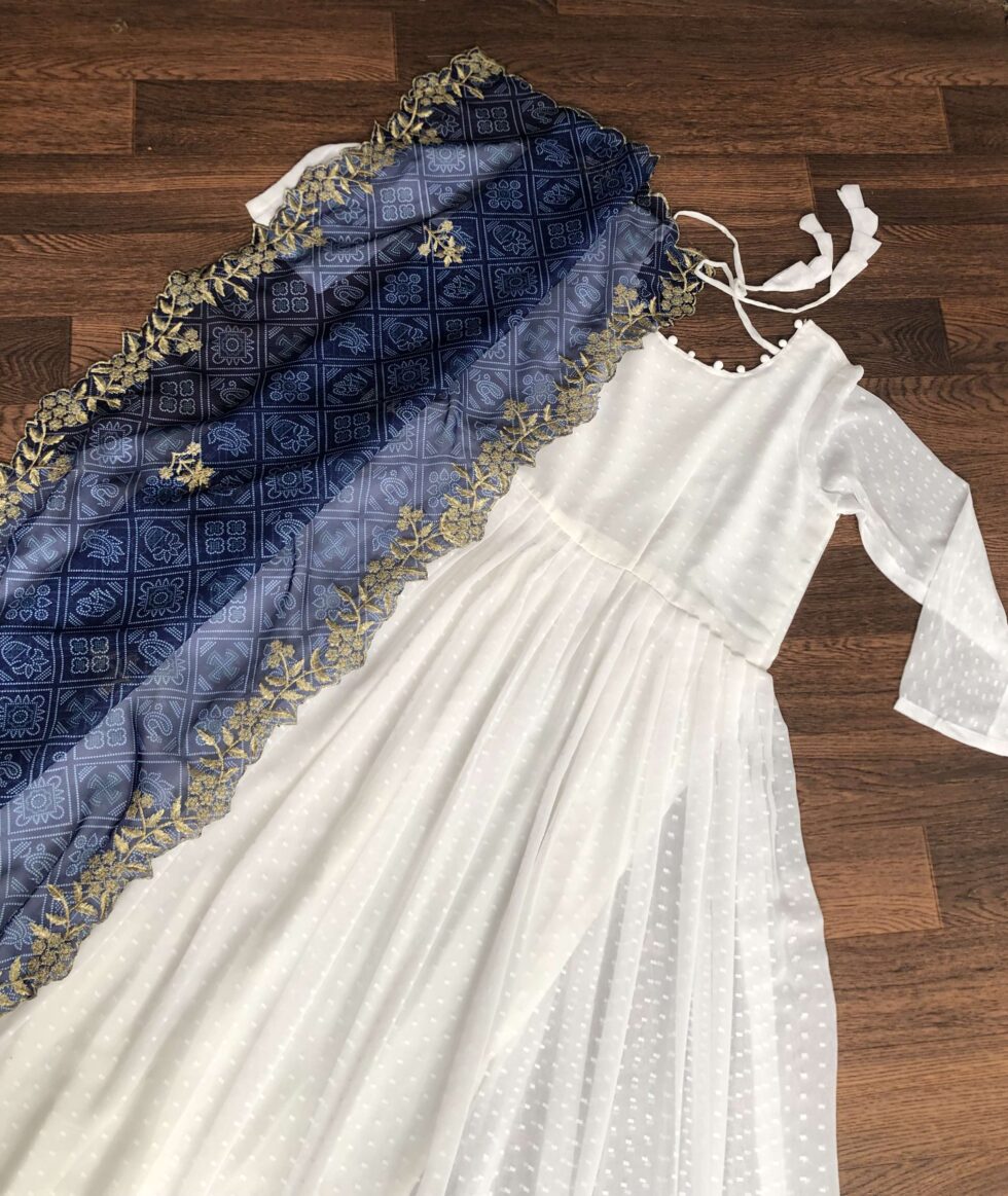 Elegant White And Blue Georgette Gown with Soft Organza Dupatta ? Premium Designer Ready-to-Wear Set