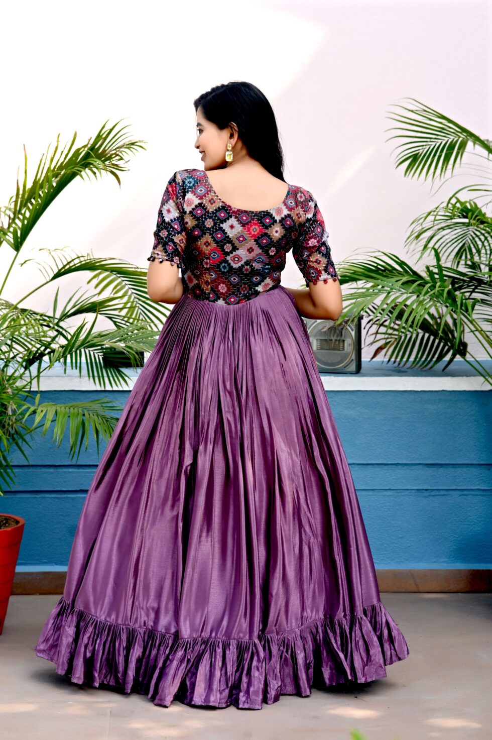 Purple Premium Chinnon Designer Gown with Sequins & Position Print ? Elegant Ready-to-Wear Dress